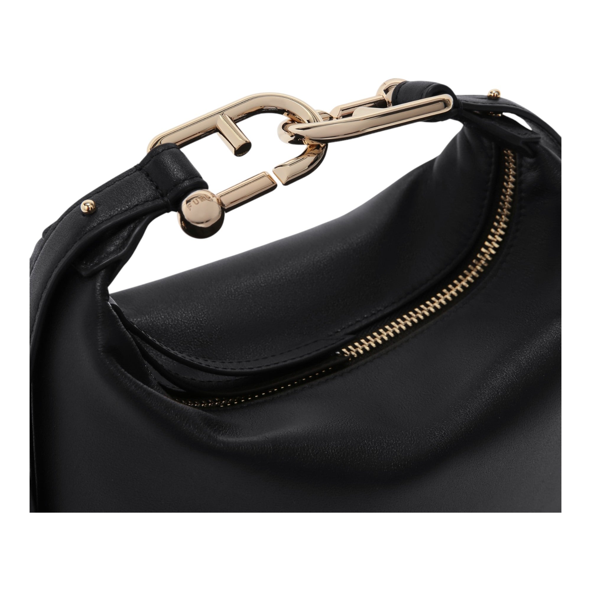 The small Furla Nuvola handbag is styled in soft leather with a natural grained finish. The rounded shape is accompanied by a top handle held together by two interlocking Arcosfera hardware accessories that combine the iconic Furla Arch logo with the brand's original spherical hallmark. Perfect as a top-handle bag, it can also be worn crossbody when paired with the new shoulder straps from this collection.