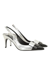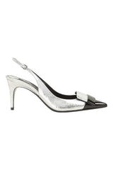 Revisiting an iconic design from the archives, these contemporary sr1 slingbacks feature a silver laminated leather with a crackled effect and a distinctive contrasting toe—embellished by a matching plaque in black patent leather. For women who like every feature of their look to reflect their own personal style.
