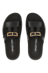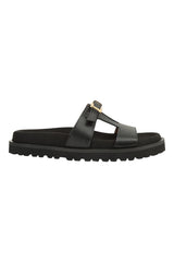 These SR Nora sandals feature a graphic and distinctive silhouette. Their symmetrical structure in all-black patent leather is embellished with a precious gold buckle, for sophisticated style.