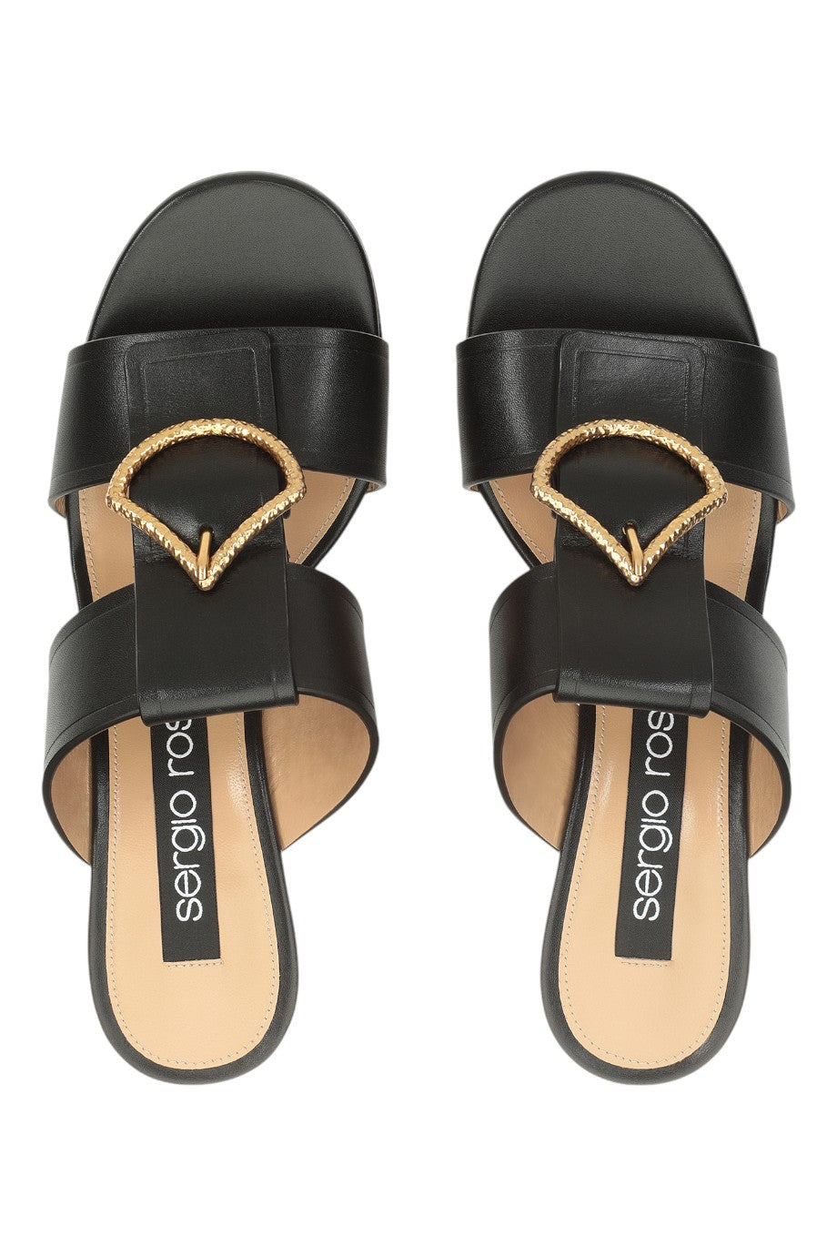 These bold sr Sea Scale sandals come in a shiny black leather. A hammered gold buckle, inspired by an iconic detail from the archives, adds an elegant touch while their distinctive heel creates an interplay of reflections. For a precious, unmistakable style.