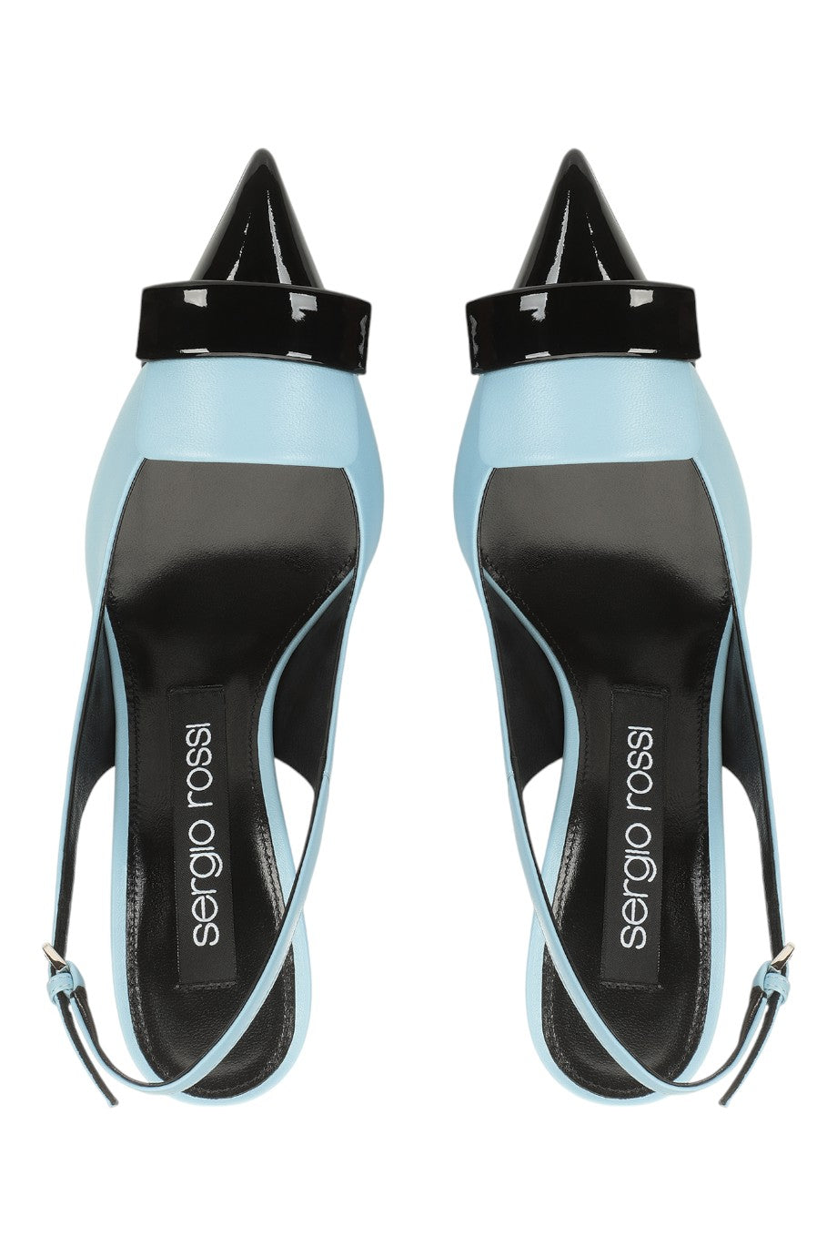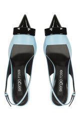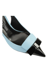 These SR1 slingbacks offer iconic lines and a contemporary design. Their silhouette features a slim heel, a romantic light blue leather, and a contrasting black patent toe with matching plaque. For women on the hunt for a look that matches their personality.